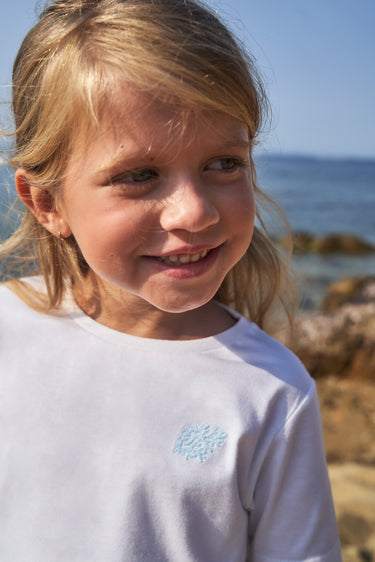 T-shirt bleu et blanc en coton 100 % biologique de la marque Sobrement, orné d'une subtile broderie corail sur la poitrine.